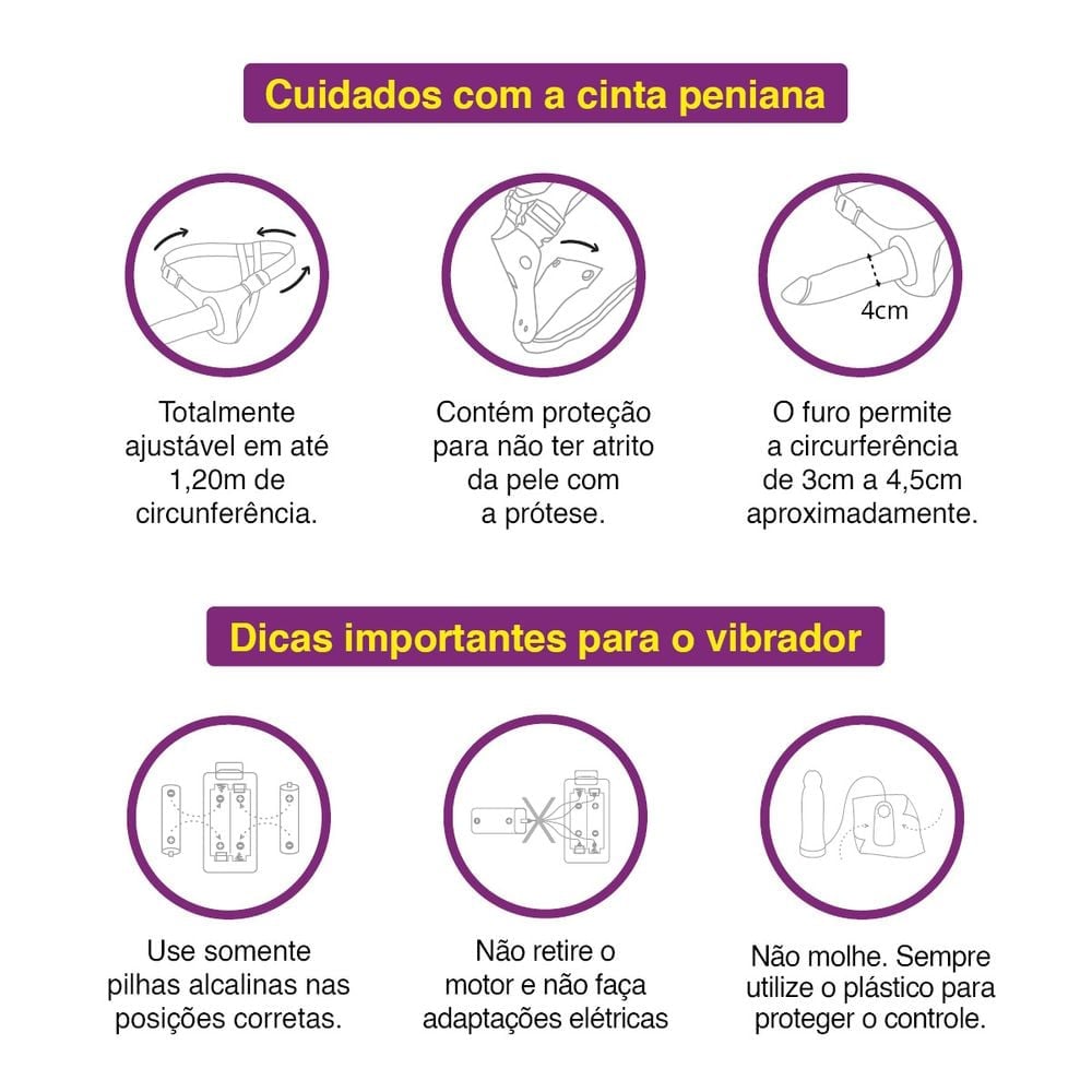 Antes do primeiro uso, e após cada utilização, limpe sua cinta e prótese com água morna e sabão neutro. Recomenda-se o uso de preservativo e lubrificante à base de água para uma experiência mais confortável e segura.