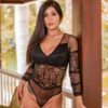 Peça única para mulheres poderosas e sensuais! Lindo body em renda trabalhada preta e microfibra. Fecho de colchetes triplos em baixo. Tiras cruzadas nas costas com alças reguláveis.