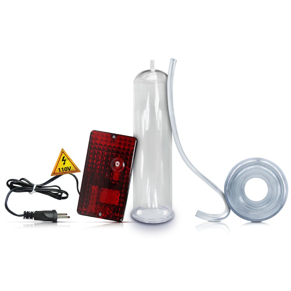 O dispositivo opera com um sistema elétrico de 110 volts, garantindo eficácia e segurança no uso doméstico. Composto por um cilindro transparente e uma bomba elétrica que regula a pressão interna, permite uma visualização clara e controle total durante o processo de exercício peniano.