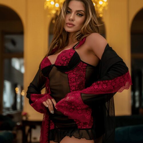 Acompanha uma calcinha da mesma linha, oferecendo um conjunto de lingerie harmonioso e muito elegante. Ideal para quem busca unir a sensualidade da lingerie à comodidade e ao luxo da camisola.