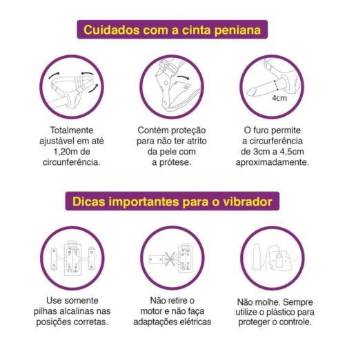 Recomenda-se higienizar a prótese com água morna e sabão neutro antes e após cada uso. Evite o contato com materiais à base de óleo, pois podem danificar o silicone. Após a limpeza, guarde a prótese e a cinta em locais separados e secos para manter sua integridade e higiene.