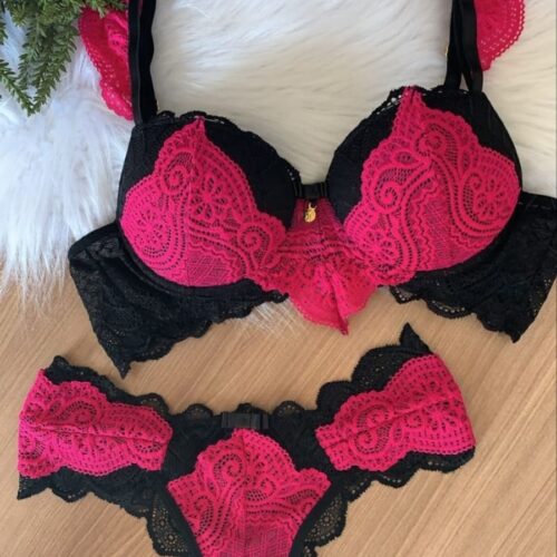 Conjunto preto com pink delicadíssimo com bojo, todo em renda sobreposta de alta qualidade antialérgica