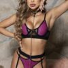 Conjunto em arrastão , tule e renda, sem bojo com aro de sustentação, acompanha calcinha com cinta ligas