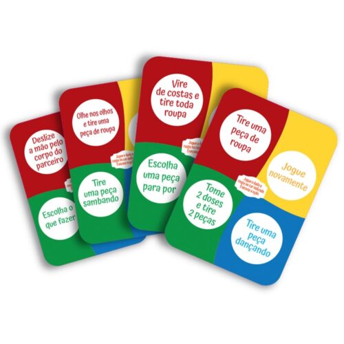 O jogo inclui 8 cartas e um dado, tudo que você precisa para uma noite cheia de surpresas. Cada carta é dividida em quatro cores – Amarelo, Azul, Verde e Vermelho – correspondendo às faces do dado. Após cada lançamento, a cor revelada indicará qual parte da carta você deverá raspar, revelando uma ação ousada que deverá ser realizada. E o melhor? O jogo é totalmente reutilizável! Mesmo após todas as opções terem sido descobertas, ele pode ser adaptado com criatividade para continuar surpreendendo.