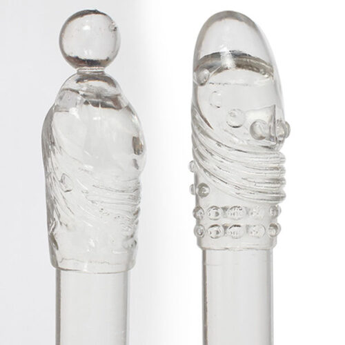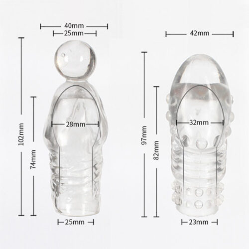 Kit com 2 capas penianas extensoras transparentes com glande definida, cerdas estimuladoras e texturas anelares – 9,8 x 3,6 cm – 10,1 x 3,5 cm