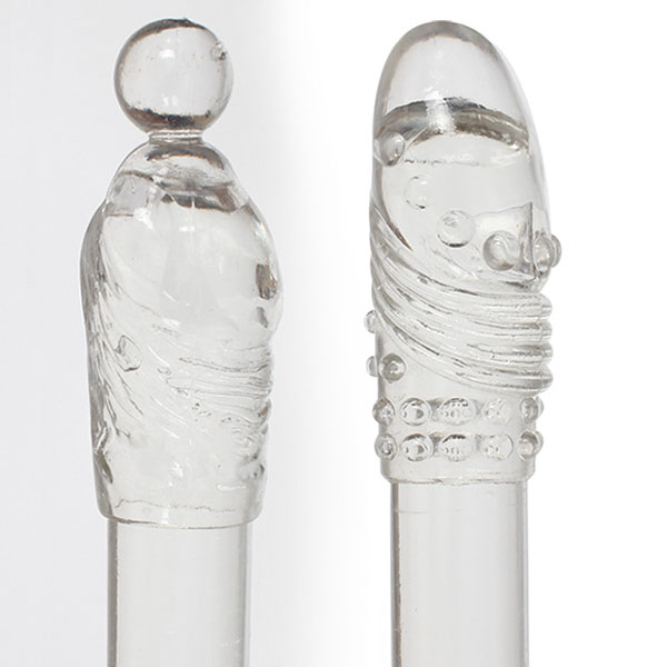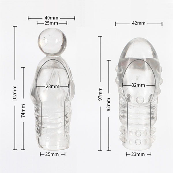 Kit com 2 capas penianas extensoras transparentes com glande definida, cerdas estimuladoras e texturas anelares Kit com 2 capas penianas extensoras transparentes com glande definida, cerdas estimuladoras e texturas anelares