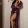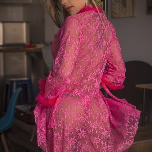 Robe longo todo confeccionado em renda com transparência, manga longa com boca levemente larga, tiras na cintura para mantê-lo fechado e bordas com plumas, deixando a peça mais charmosa e encantadora. Além disso, acompanha uma linda calcinha fio dental em renda com elástico na cintura. Surpreenda seu amor e mostre toda sua sensualidade!